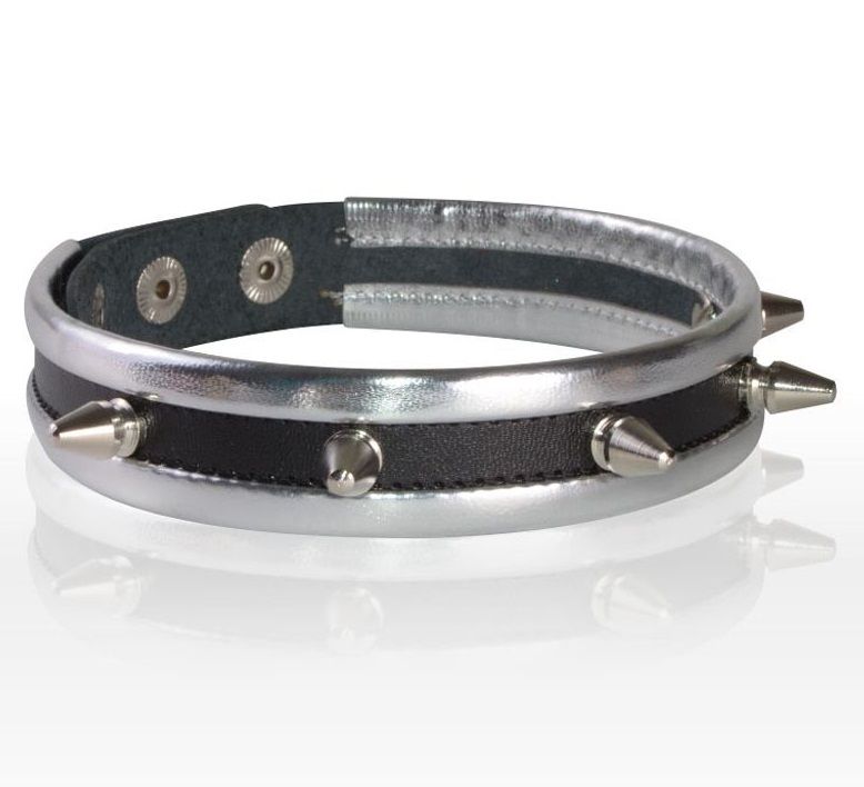 Узкий ошейник из плотной натуральной высококачественной кожи черного цвета с серебряной контрастной отделкой, украшенный пятью серебристыми металлическими шипами. По краю ошейника проходит оторочка, обеспечивающая комфорт при ношении. Оденьте ошейник на шею и зафиксируйте с помощью кнопок с никелированным покрытием. Ширина - 2 см.