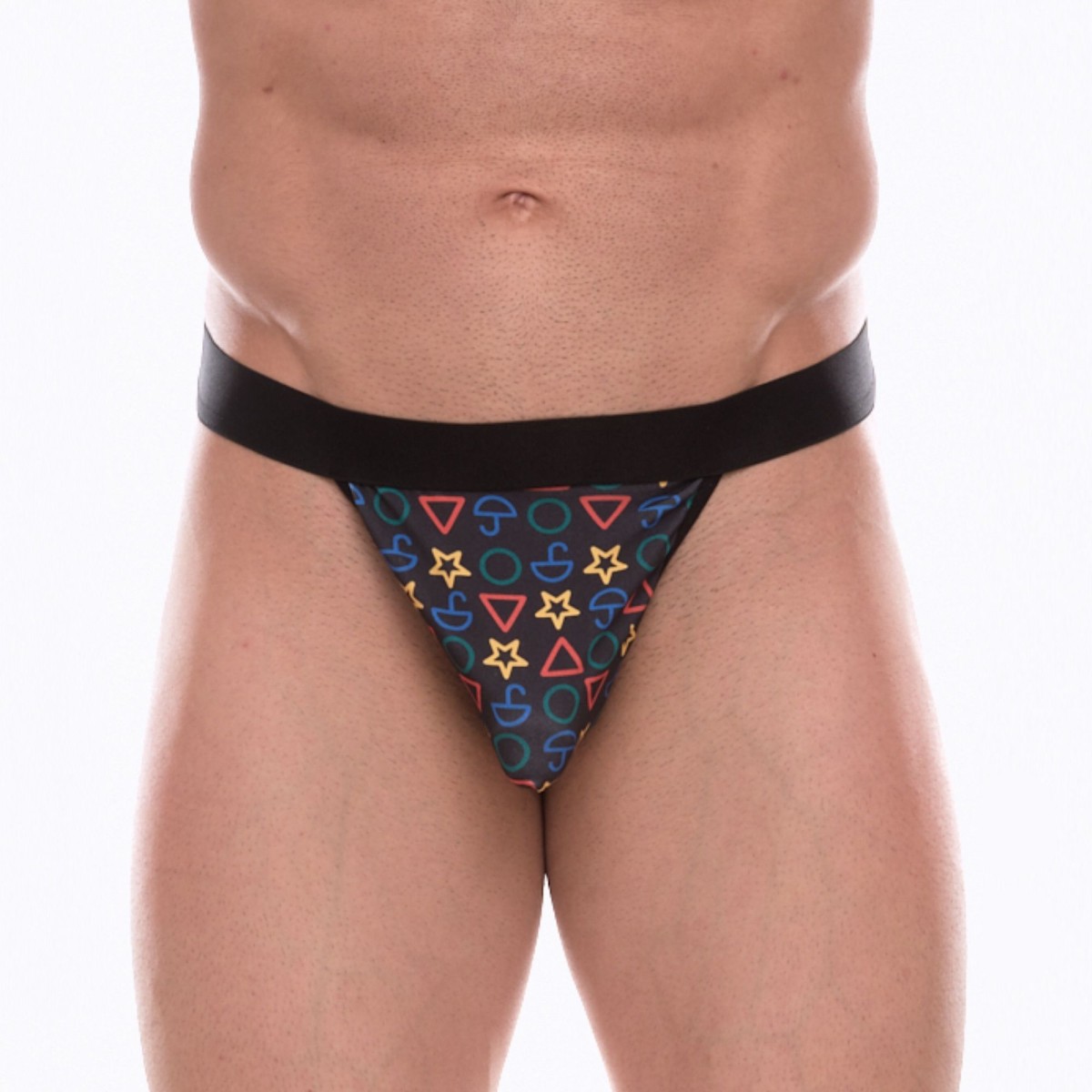 Темно-серые трусы-тонги с разноцветным принтом.