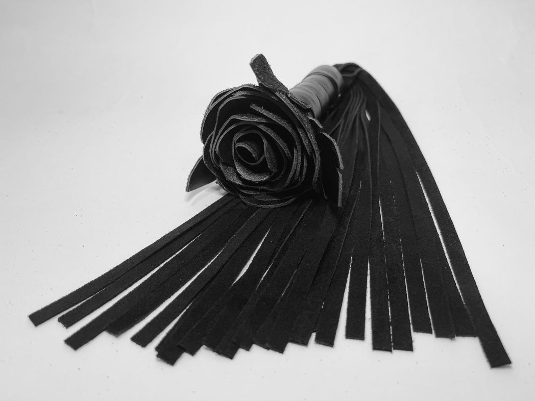 Восхитительная мини-плеть, украшенная чёрной розой. Цветок и рукоятка полностью выполнены из мягкой натуральной кожи, а хвосты плети - натуральная мягкая замша. Размеры этой плети очень изящны, поэтому данную плеть можно использовать, как генитальную, чтобы добавить новых ярких ощущений. Розочка очень удобно лежит в руке и создает неповторимую атмосферу и настроение, этот аксессуар никого не оставит равнодушным!