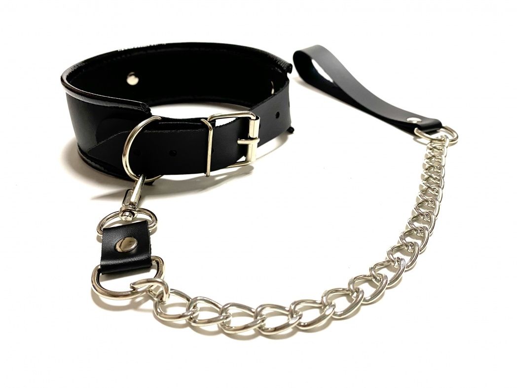 Комплект аксессуаров из ошейника с металлическим поводком, выполненный из черной искусственной кожи. Ошейник декорирован бантиком спереди и металлическим полукольцом, к которому пристегивается поводок. Основная часть выполнена из матовой эко-кожи, а бант и вставки по краю - из лаковой, что придаёт ошейнику изящества. Этот комплект поможет добавить разнообразия и стать волнующим элементом любовной игры. Экономичный, экологичный и функциональный аксессуар! Ширина - 4,5 см. Длина поводка - 45 см.